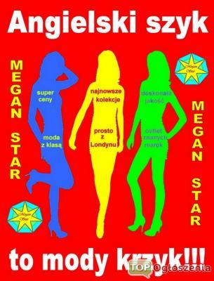 "Megan Star" to moda angielska w najlepszym wydaniu. Towar do naszego sklepu dociera bezpośrednio z angielskich hurtowni. Prowadzimy sprzedaż końcówek kolekcji - tzw. outlet znanych brytyjskich firm odzieżowych jak m.in. New Look, Dorothy Perkins, Soul Cal , Bay i wielu innych. Oferujemy odzież młodzieżową i damską w tym: bluzki, gorsety, swetry , bluzy , sukienki i spódniczki z najnowszych kolekcji. "Megan Star" to moda z klasą w super atrakcyjnej cenie. Zapraszamy!!!meganstar.sklepna5.pl/