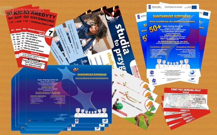 Oferujemy m.in.: ulotki, papier firmowy, teczki ofertowe, kalendarze, plakaty, wizytówki, notesy, katalogi.
